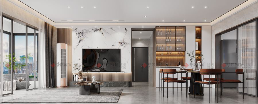 | 設(shè)計(jì)說(shuō)明:本案客廳采用“無(wú)主燈”設(shè)計(jì),整體為現(xiàn)代風(fēng)格設(shè)計(jì)手法,呈現(xiàn)出年輕人所青睞的新時(shí)代舒適居所??蛷d用多種燈光營(yíng)造不同情景的效果,烘托溫馨的氛圍,簡(jiǎn)潔、大氣、舒適?;疑y理地磚,利落的金屬線條,偏硬朗的現(xiàn)代風(fēng)格,優(yōu)雅簡(jiǎn)潔。舒適的布藝沙發(fā)搭配大幅現(xiàn)代簡(jiǎn)約畫作,極具現(xiàn)代感;電視背景墻做木柵格設(shè)計(jì),時(shí)尚溫馨;吊頂線型軌道燈設(shè)計(jì),現(xiàn)代感滿滿。餐廳設(shè)計(jì)儲(chǔ)納柜,增加儲(chǔ)納空間。臥室采用木地板地面鋪貼更溫馨,簡(jiǎn)約的掛畫和時(shí)尚的床頭燈做裝飾,空間簡(jiǎn)約舒適。 | |||