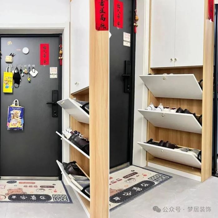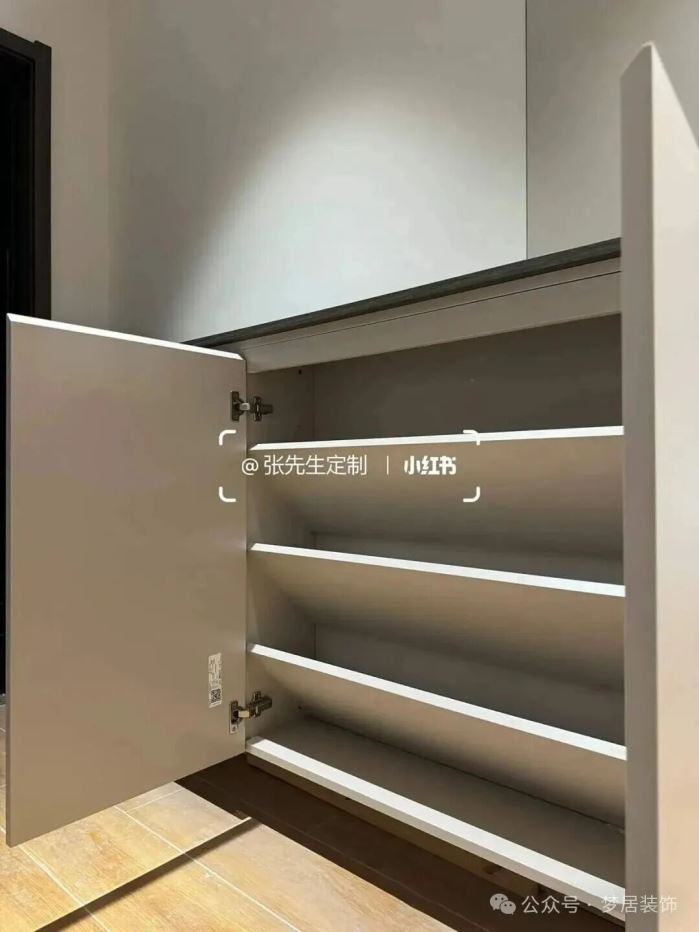鞋柜深度可以做到40cm,將層板內(nèi)縮10cm,柜門掛架放置拖鞋,也能擴容,并且完全不影響柜門開關(guān)。