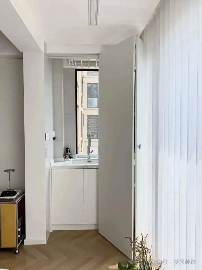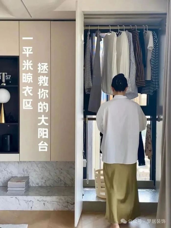 隱藏晾衣區(qū),晾衣服不暴露在外,家里來客人也不會看到。把晾衣區(qū)藏在柜門里,關(guān)上門陽臺清清爽爽。