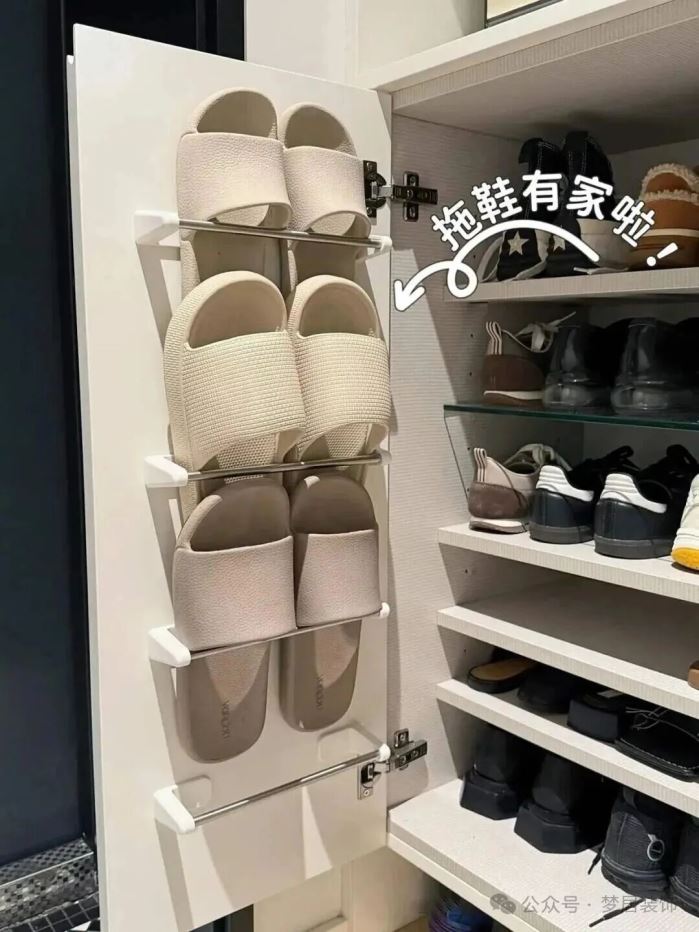將隔板斜著裝,哪怕深度只有20cm,黃金45°斜插法,鞋子也能穩(wěn)穩(wěn)架在上面,隨手拿,不費勁。