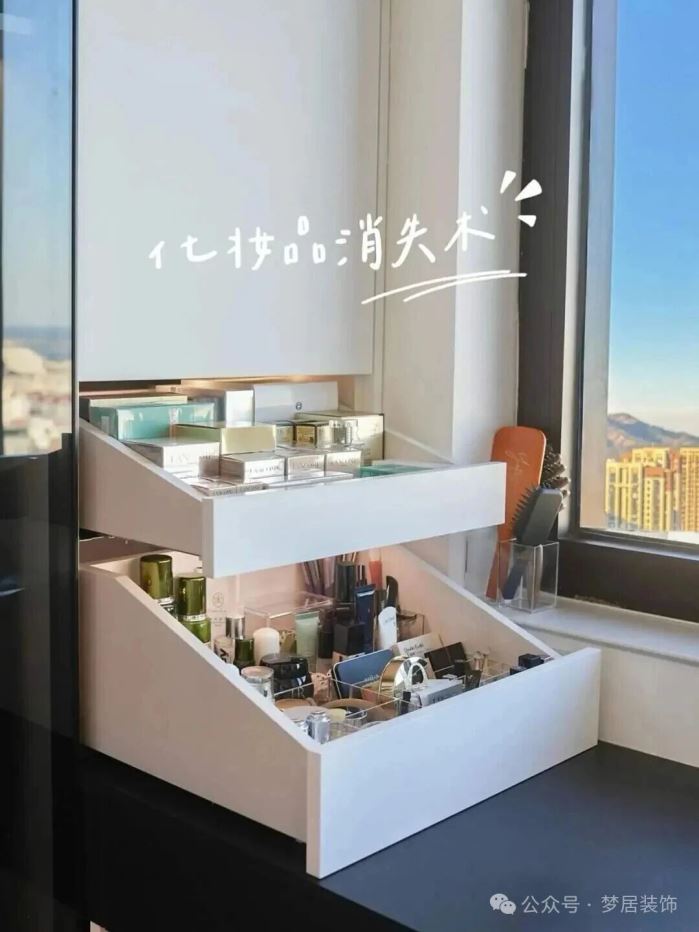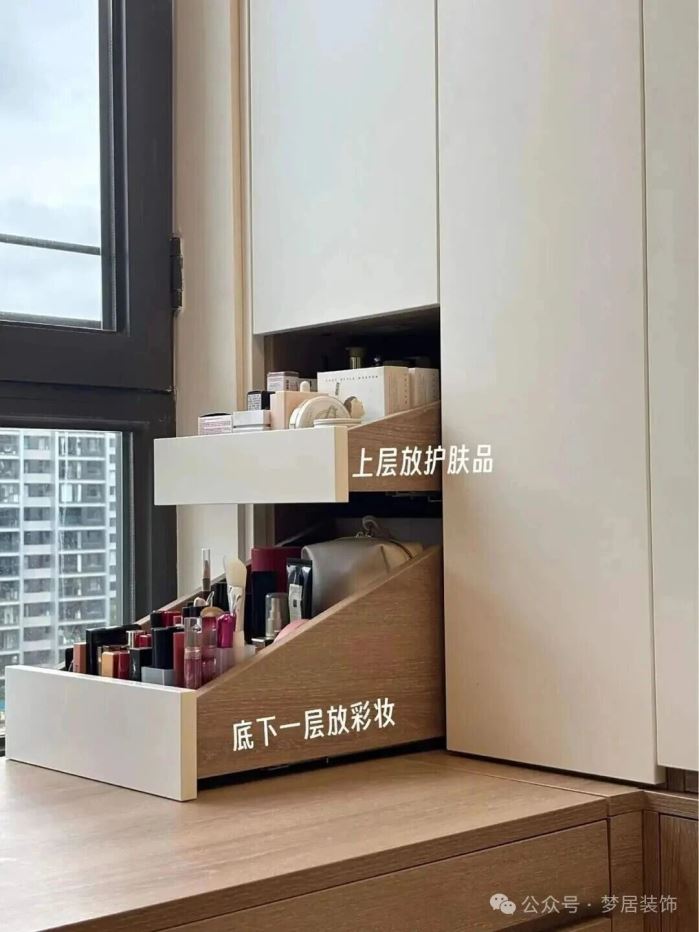 梯形的抽屜內(nèi)深外淺,柜門不做滿,方便看化妝品擺在哪個位置,這個設(shè)計真是太絕了,