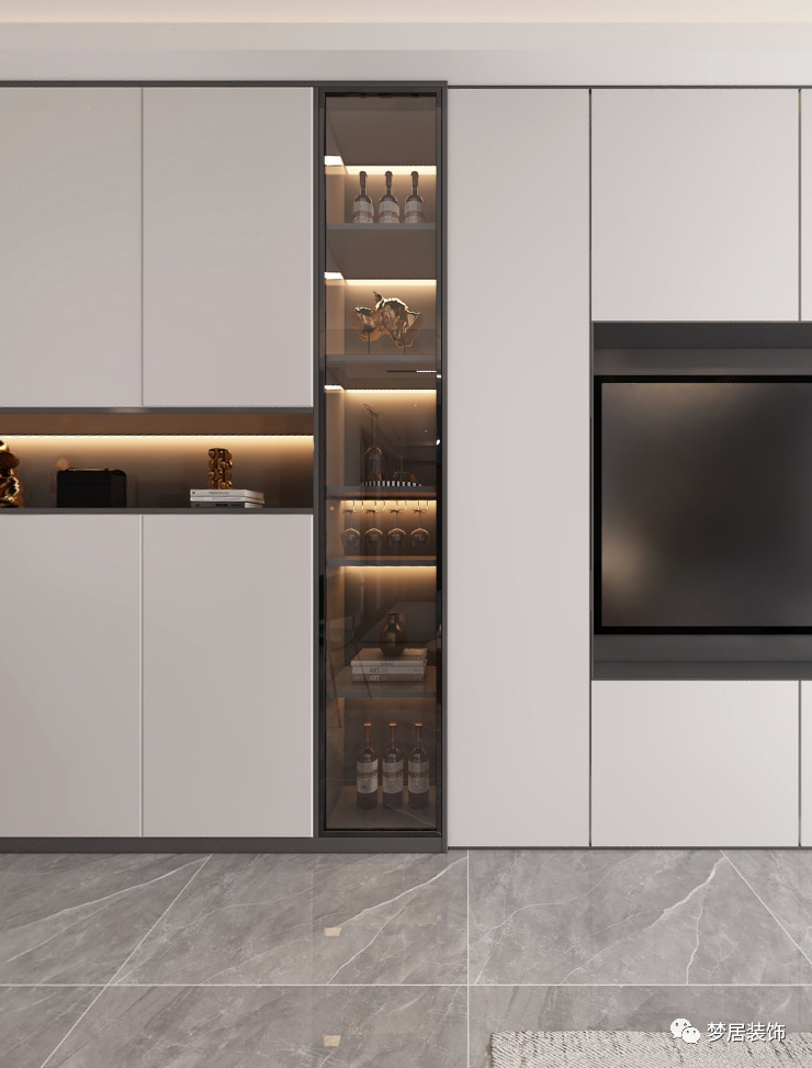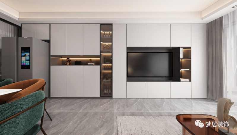現(xiàn)代簡約設(shè)計風格追求自由,室內(nèi)空間開敞通透。電視背景墻為整排收納柜滿足收納所需,電視內(nèi)嵌讓視覺更整體。使用玻璃、不銹鋼等新型材料作為輔材,給人的感覺前衛(wèi)大氣。