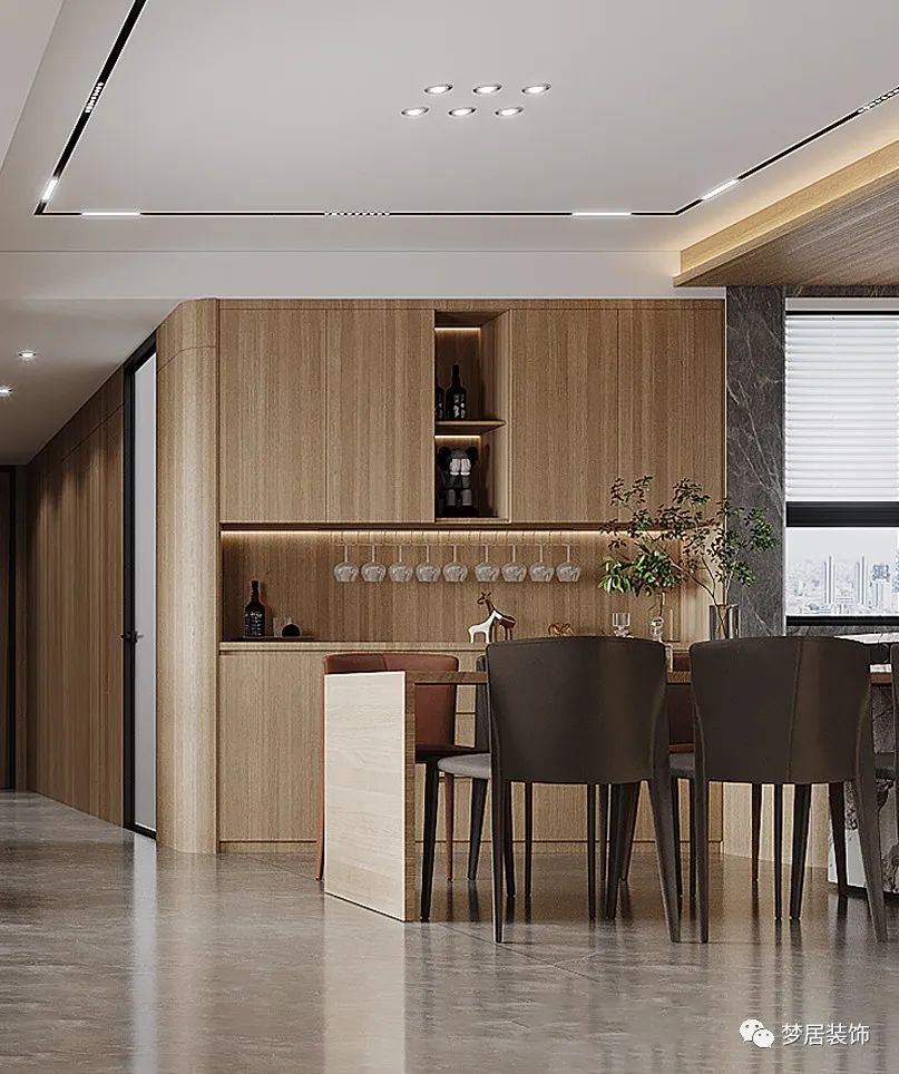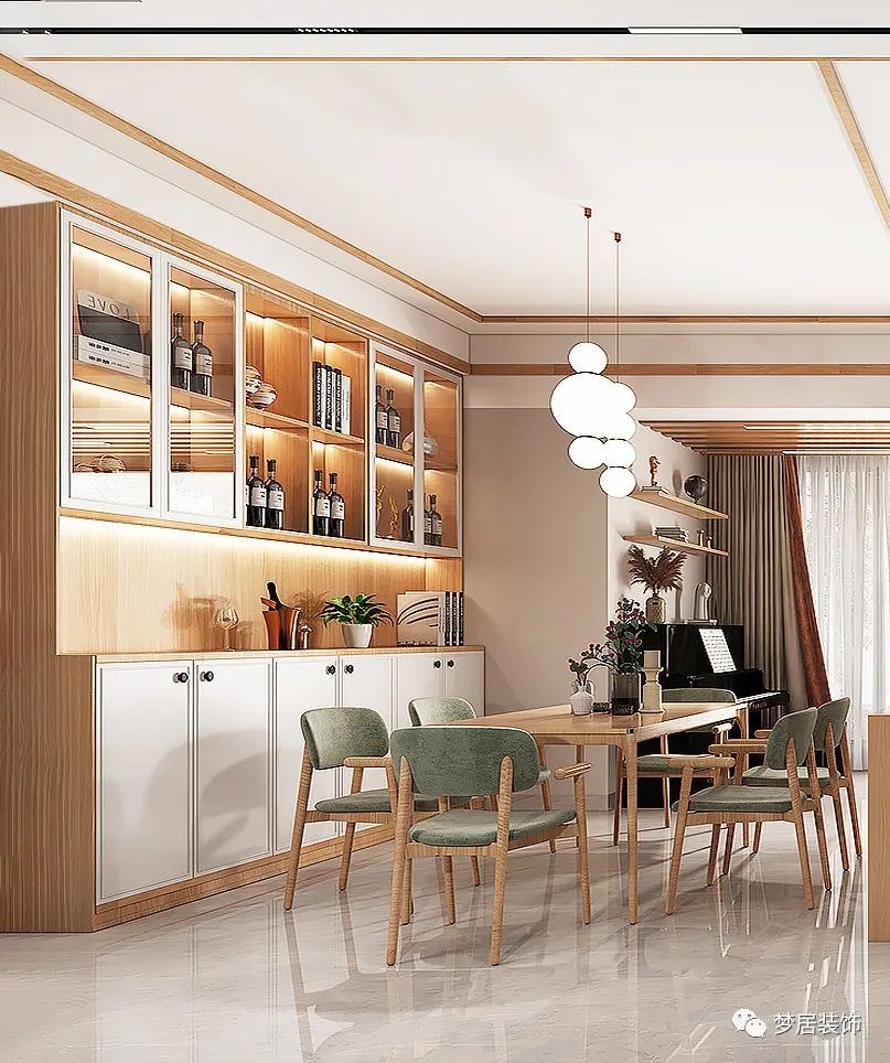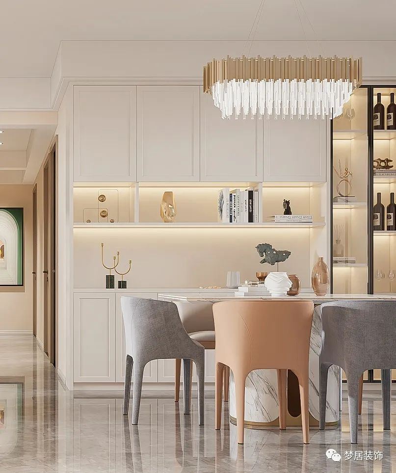 將裝飾品、手辦、喜歡的物件單品放置到展示柜中,裝上燈帶,為餐廳帶來(lái)精致氛圍。展示柜可以安裝玻璃柜門,避免落灰問(wèn)題,減少日常家務(wù)。