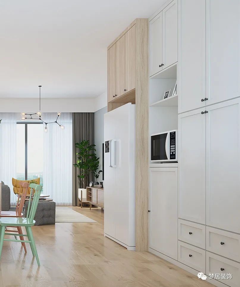 冰箱的厚度比日常的餐邊柜要厚一些,冰箱部分的柜子可以和冰箱做到同一水平面,剩余部分餐邊柜還是保留原有厚度。若追求厚度一致,柜子看起來(lái)就會(huì)比較“笨重”。