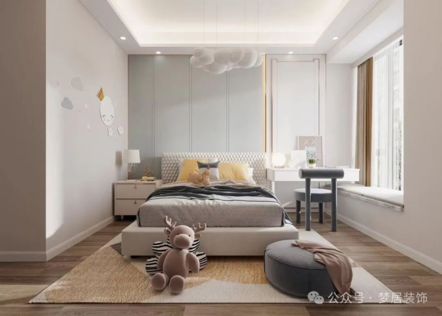 轉(zhuǎn)用更為年輕化的設(shè)計(jì)來(lái)創(chuàng)造兒童房,淺綠色為主的設(shè)計(jì)語(yǔ)言律動(dòng)著空間,充滿著活力與爛漫。傳統(tǒng)書桌改為壁桌,增加空間的實(shí)用性??蓯?ài)的裝飾擺件尤為奪目,既匹配孩子的天真童心,也使視覺(jué)層次更為豐富,讓空間洋溢著更為活潑的氛圍。
