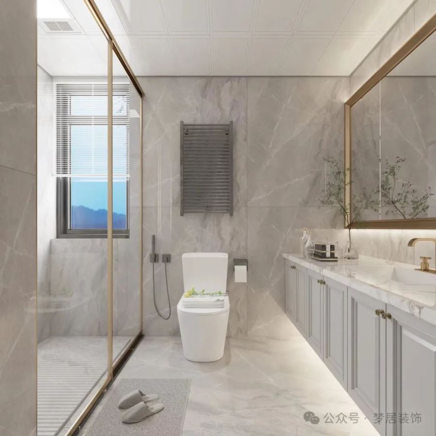 設(shè)計(jì)師采用拉絲金屬與清玻結(jié)合,空間增加隱藏?zé)艄馀渲?,所有配置一?yīng)俱全,用陳列的方式構(gòu)筑舒適奢雅的衛(wèi)浴空間。線條則引入一種有序的理性之感,進(jìn)而流露出現(xiàn)代輕奢主義中的舒適美學(xué)。