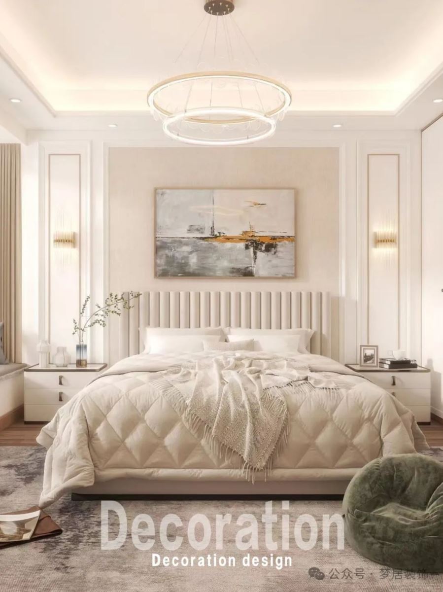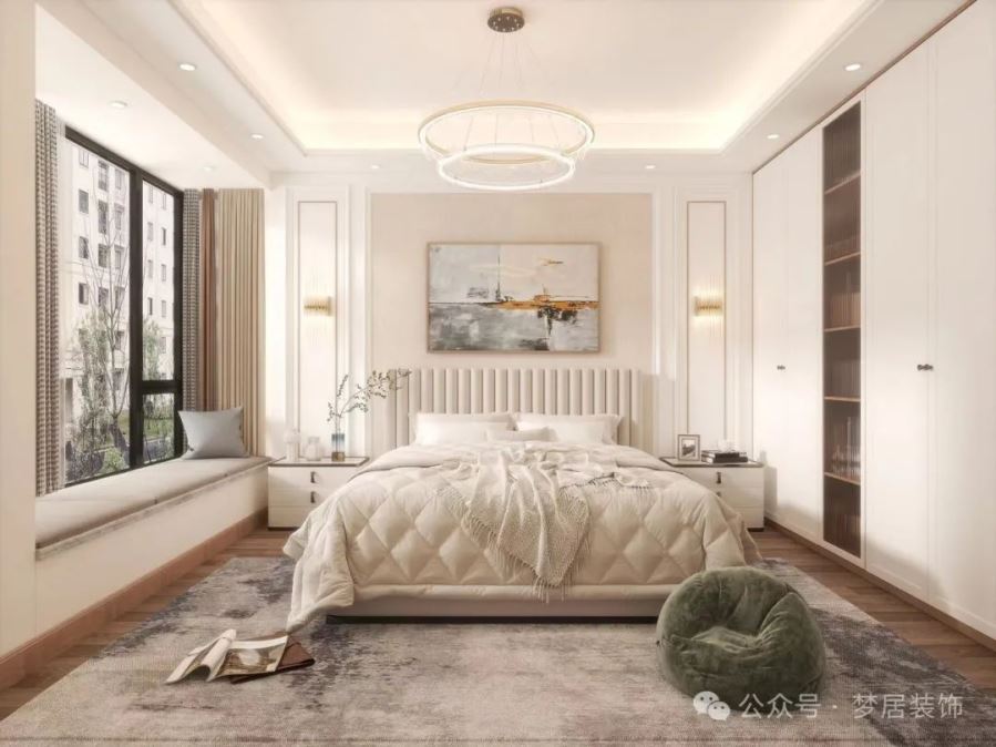 主臥作為私密的個(gè)人空間,彰顯居者的品味喜好。設(shè)計(jì)師以奶白色為肌底,金屬材質(zhì)裝點(diǎn)其上,予人安謐的視覺(jué)享受以及復(fù)古摩登氣韻的蔓延,將日常生活情境與審美精神在同一范疇交融,融合紡織品輕奢的纖維質(zhì)感,進(jìn)一步增進(jìn)空間的松弛感,墻面金屬裝飾線條及壁燈彰顯著輕奢奢華質(zhì)感。