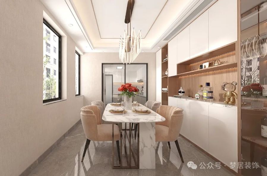 餐廳布置以淺色為主,優(yōu)雅中流淌出對(duì)生活品質(zhì)的細(xì)膩?zhàn)非?,流暢自然。品牌餐桌椅的選用,兼具復(fù)古與現(xiàn)代的優(yōu)雅感,陳列著的精致餐具,讓四季三餐、一蔬一飯?jiān)诩业臏嘏蝎@得超乎果腹的意義。水晶吊燈的呼應(yīng)讓藝術(shù)的精致在空間中流動(dòng),傳達(dá)著屬于家的慢節(jié)奏生活。