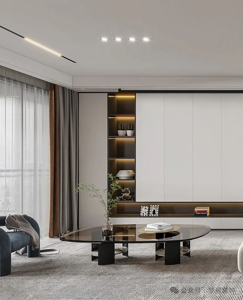 或者為了能有更多的收納空間,可以去掉電視,做一個(gè)滿墻儲(chǔ)物柜設(shè)計(jì),收納一眾雜物,客廳干凈清爽。