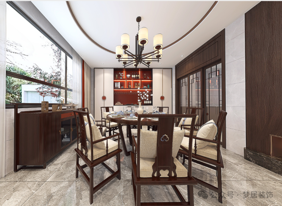 中式圓型天花設(shè)計,下面擺上圓桌,整體下來也是很協(xié)調(diào)。深木色家具的搭配更顯大氣儒雅。