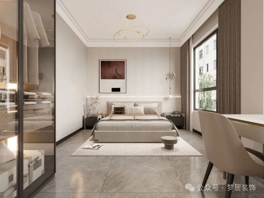 主臥顏色選用淺杏色與暖灰色調(diào)的搭配,燈光作為點綴,舒適而靜謐,素雅清秀,感受著生活的舒適溫馨。