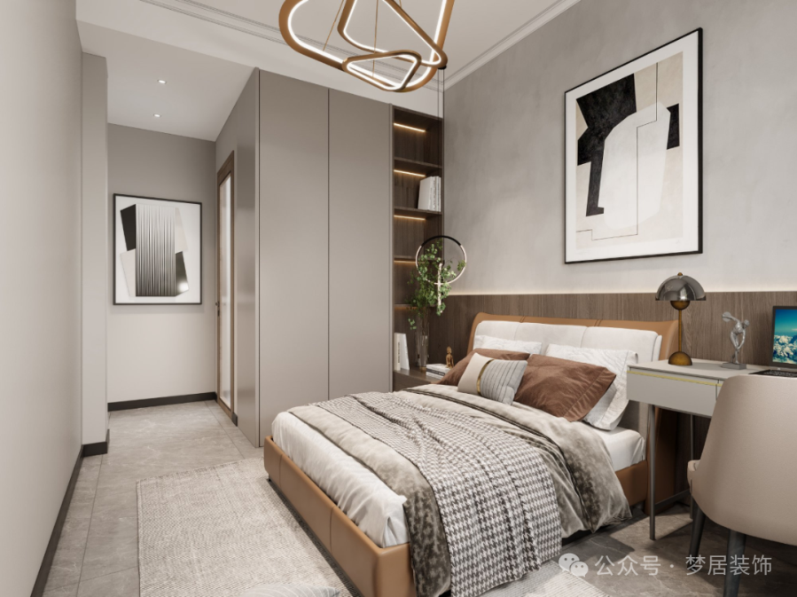 次臥設(shè)計手法和搭配上更現(xiàn)代時尚,不變的是色彩上的 “暖”基調(diào),營造了空間的舒適和溫馨,軟硬裝搭配和諧統(tǒng)一。