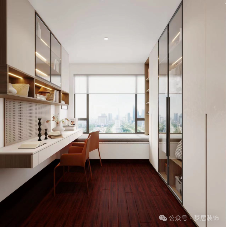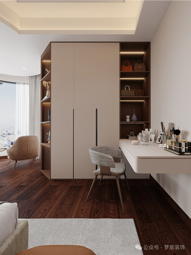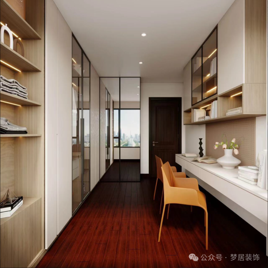 衣帽間同時作為書房在使用,方便工作也方便衣物收納。泡一杯咖啡,在書桌開啟專注工作,累了可以看看窗外眺望遠(yuǎn)方。