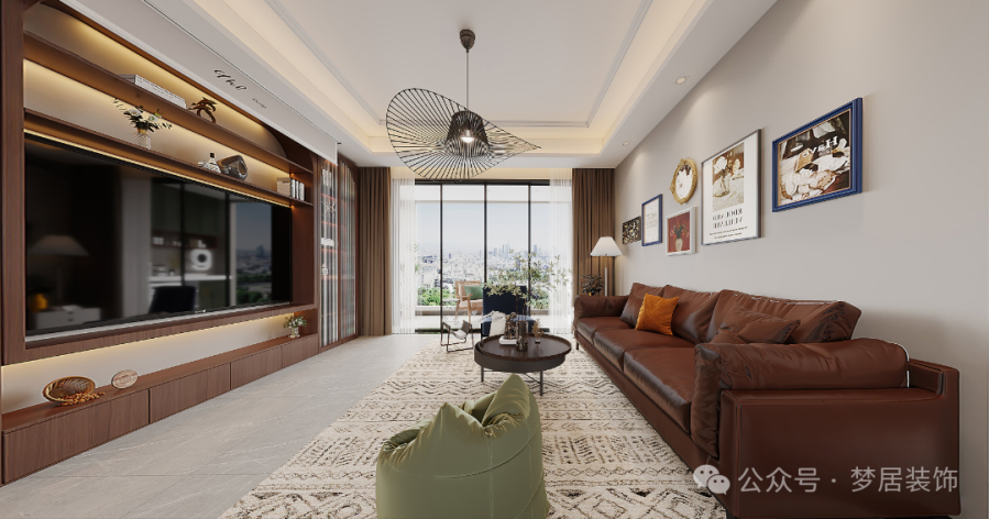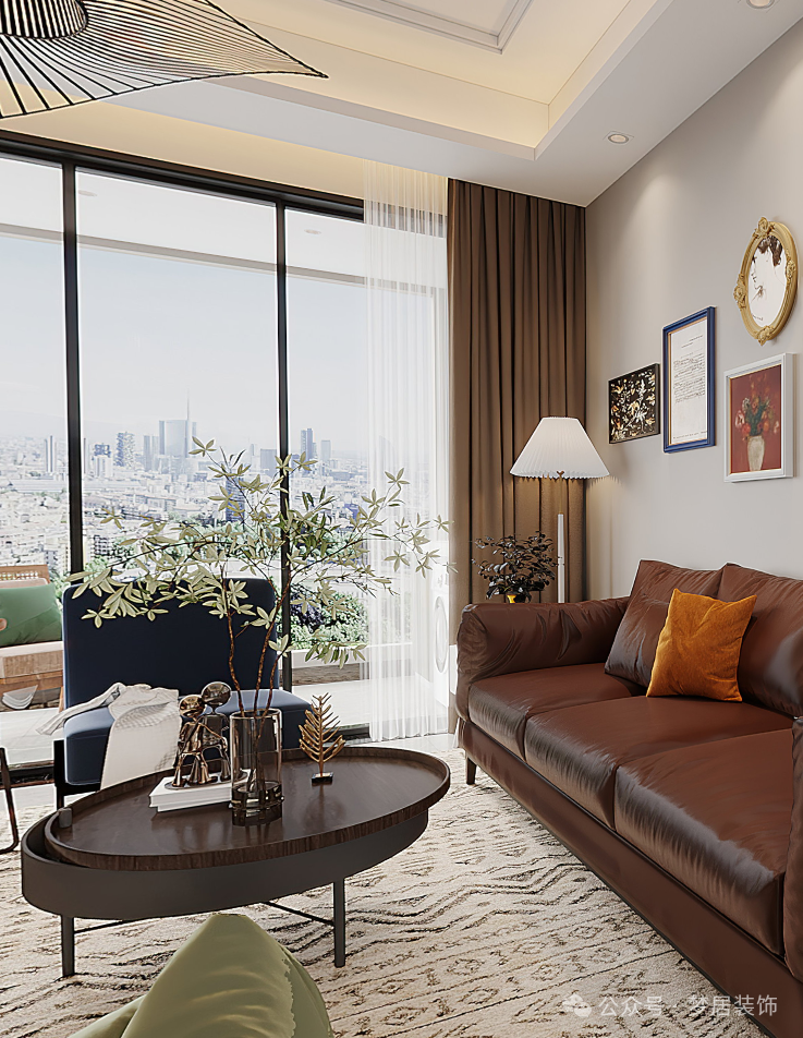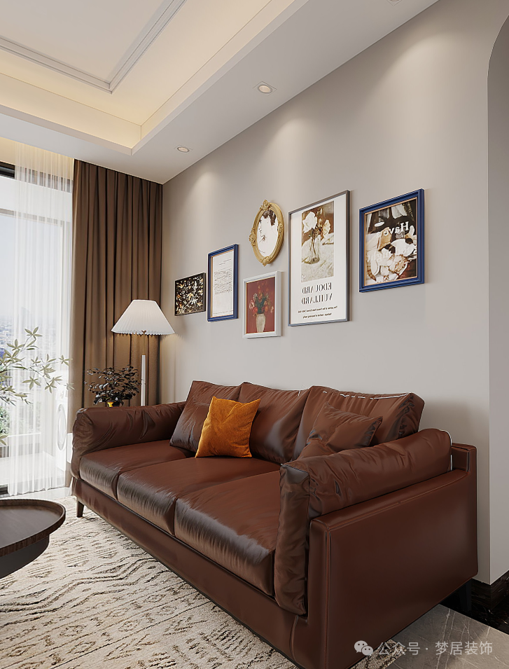 整體空間以復(fù)古的焦糖色為主,皮質(zhì)沙發(fā)、摩登個性的掛畫和金屬元素點綴,美式復(fù)古氛圍更濃郁,搭配復(fù)古花紋的地毯,電影感氛圍滿滿。
