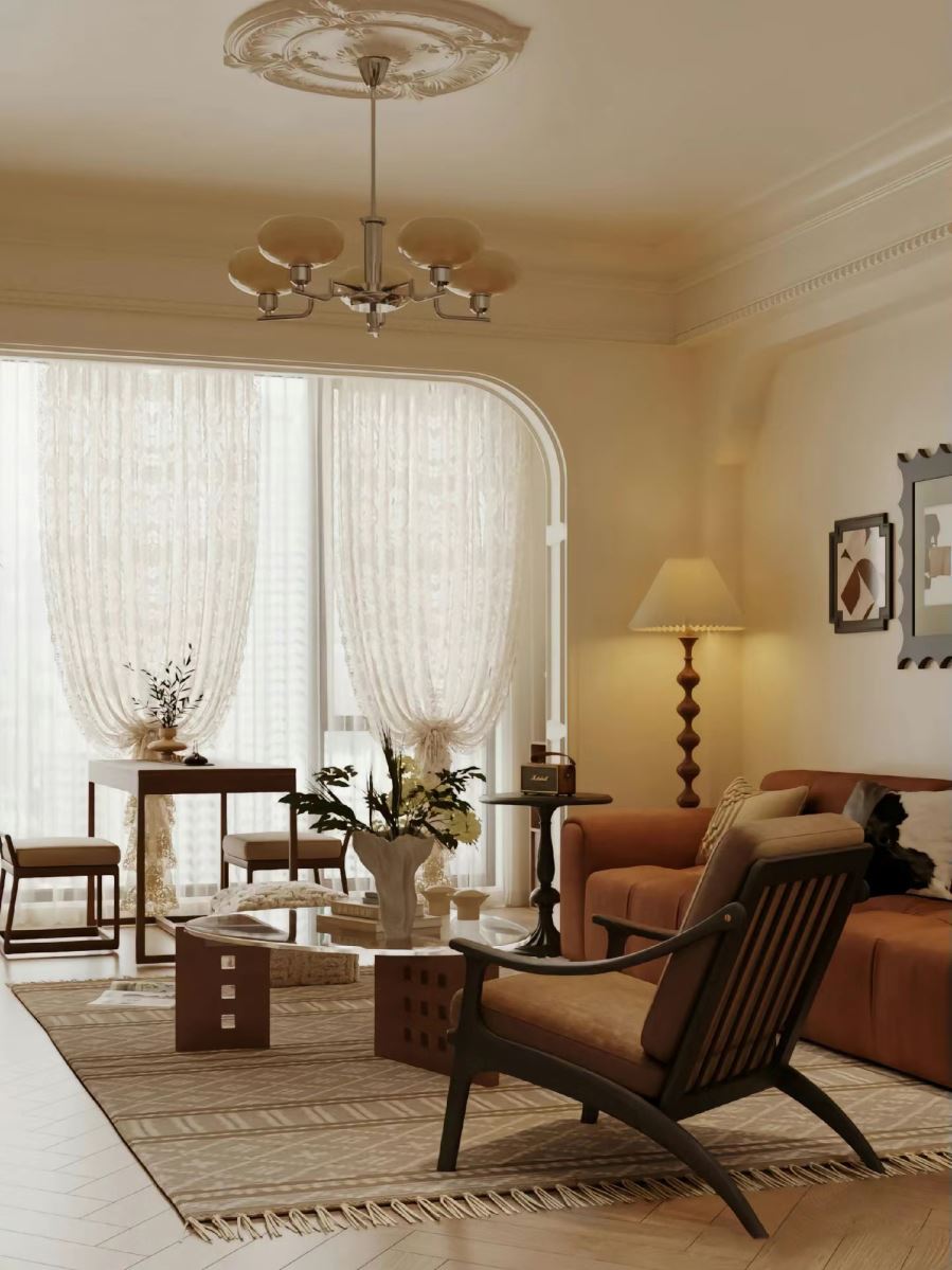 中古風(fēng)的軟裝元素則注重造型簡約和家具精致的線條感。