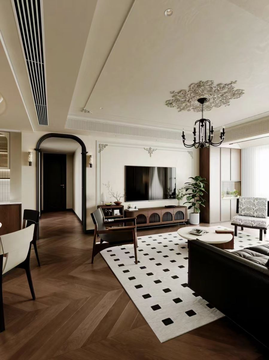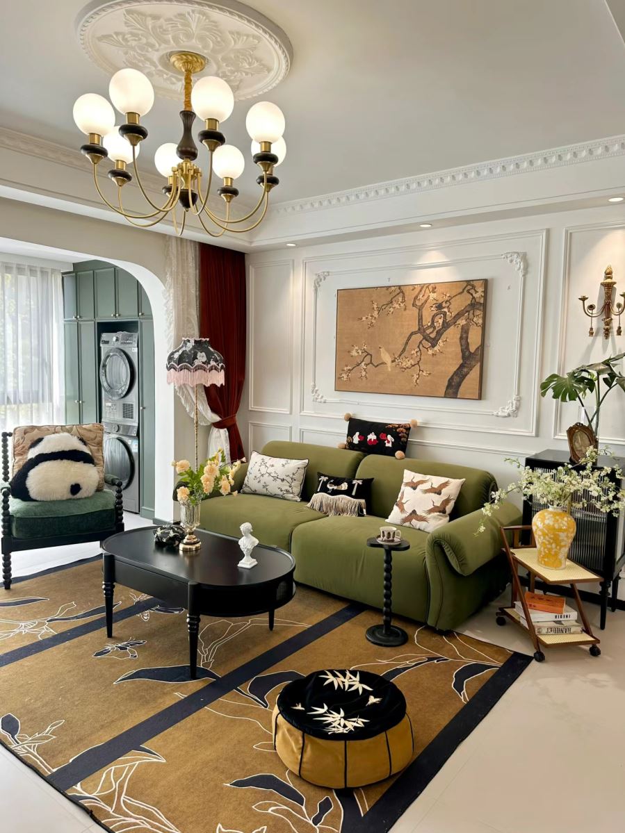 此外,中古風(fēng)的地毯大多采用視覺感受柔和的純淺色地毯,比如米色、米灰色、米黃色等等,深色做點綴。一般會用在空間硬裝和家具采用的彩色過多的情況。
