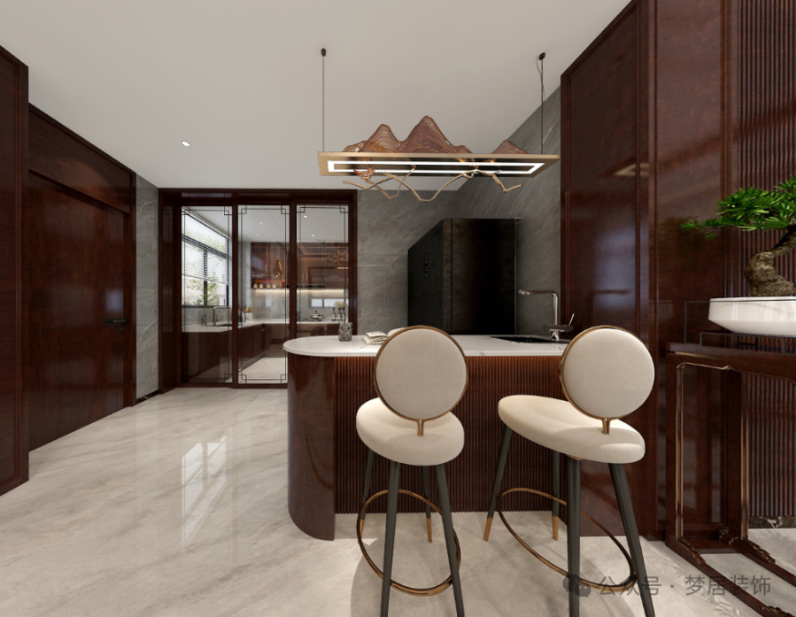餐廳旁設(shè)置了吧臺,吧臺的設(shè)計(jì)融合了傳統(tǒng)中式元素和現(xiàn)代設(shè)計(jì)理念,創(chuàng)造出既有傳統(tǒng)韻味又不失現(xiàn)代感的空間體驗(yàn)。