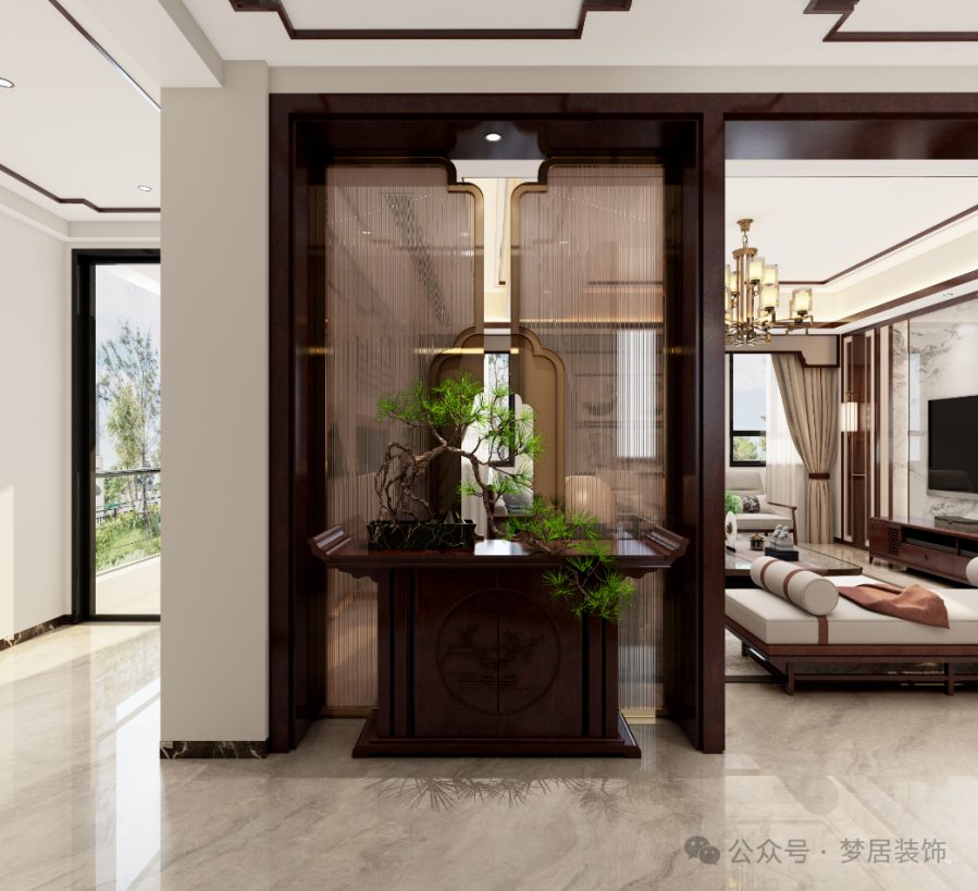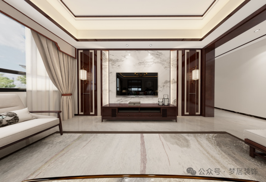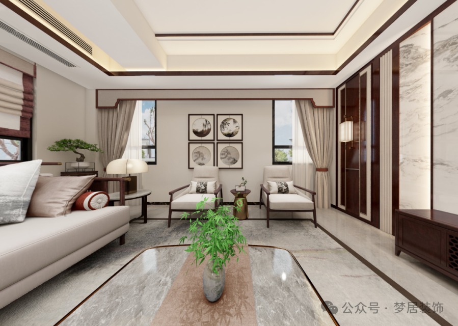 新中式客廳為對稱式布局,高闊寬敞,典雅大氣,選用造型簡樸優(yōu)美的中式家具,格調(diào)高雅。