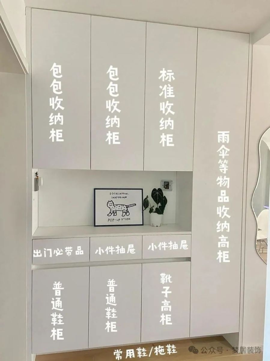 上下平開門用來收納鞋子包包,這樣既整潔美觀,又能滿足不同物品的收納需求。