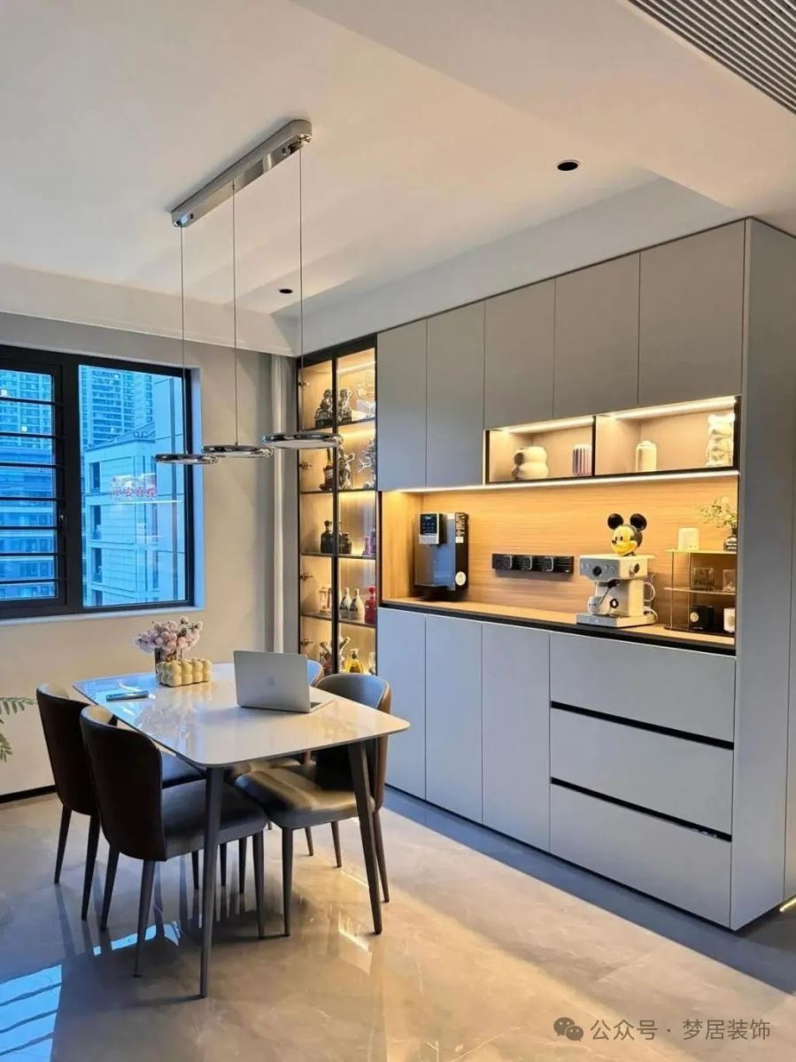 餐邊柜加上燈帶氛圍感超絕,柔和溫暖的燈光打在上面,無濾鏡也很美,還能輕松就找到所需物品,提升用餐時的幸福感。