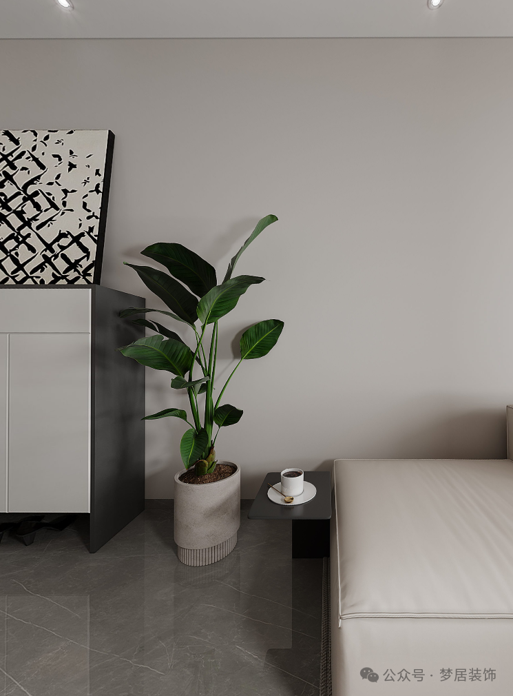 黑白配色,干凈純粹。黑色的電視搭配現(xiàn)代極簡(jiǎn)的電視柜,放置時(shí)尚氛圍燈和小綠植,為客廳打造出簡(jiǎn)練時(shí)尚氛圍。