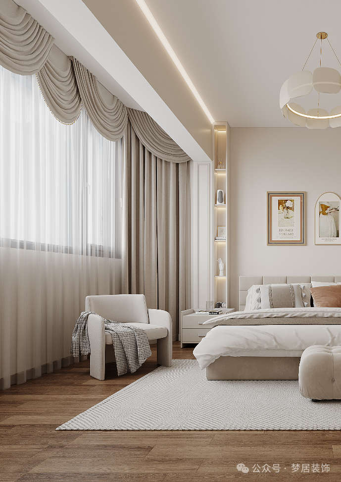 奶白色的床品與全屋調(diào)性完美契合,搭配木地板透著無限溫暖,木質(zhì)和奶白色的和諧搭配,共同營造出寧靜而愜意的休憩氛圍,給業(yè)主高品質(zhì)的松弛自在。