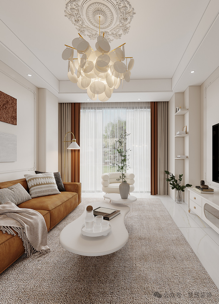 唯美浪漫的貝母吊燈搭配吊頂法式雕花燈座,陽光穿過窗簾,灑落在客廳,為客廳添上一層溫暖濾鏡,光影交互,精致溫馨,散發(fā)出法式奶油的馥郁芬芳。