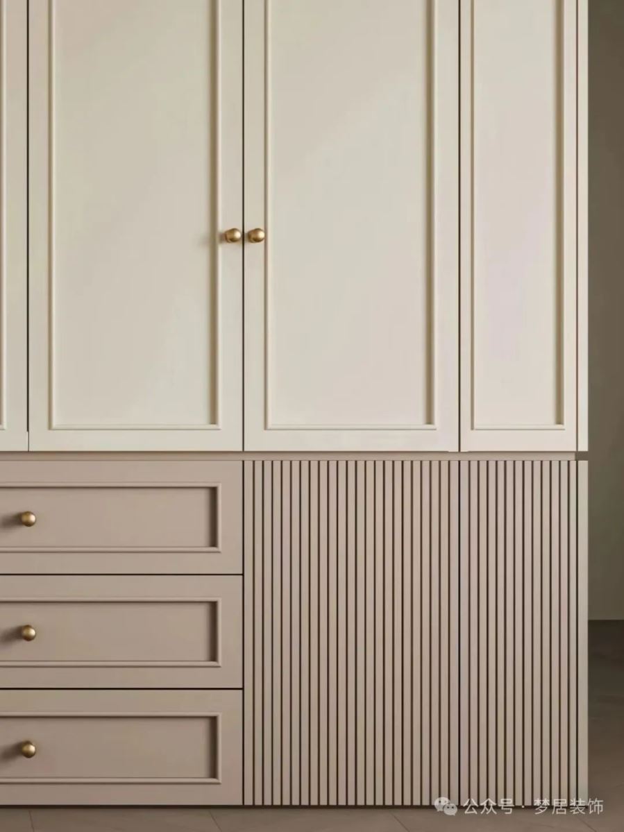 喜歡拼色的可以少量選擇莫蘭迪色系的淺灰綠、臟粉、少女粉等進行拼接,柜門用金色質感圓潤的拉手來提升精致感。