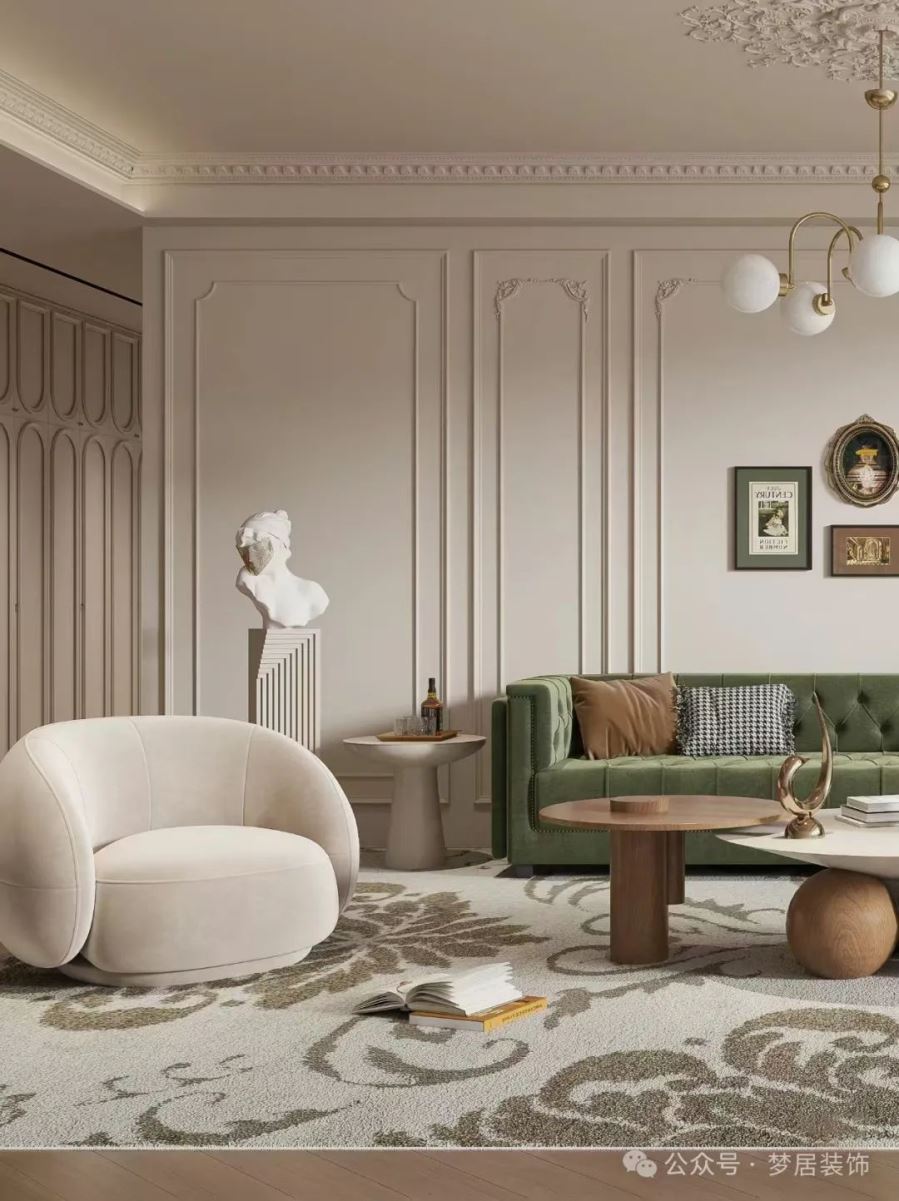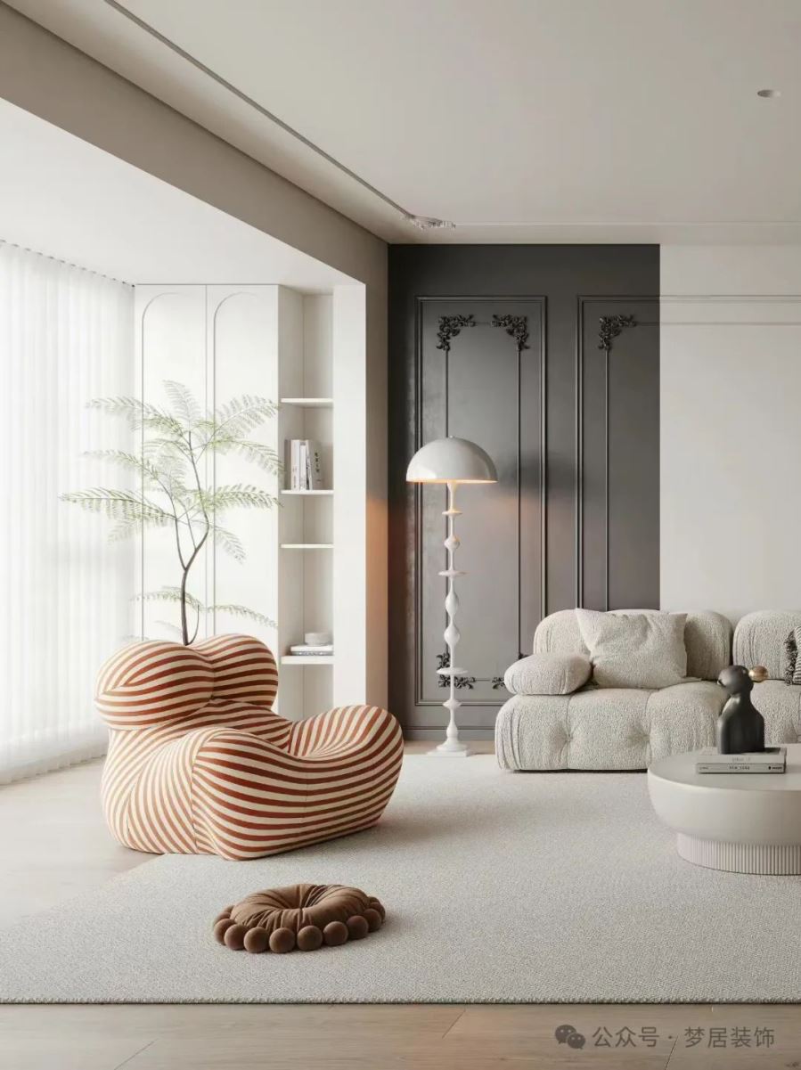 顏色選白色或復古綠、杏色、咖色,用弧形沙發(fā)、面包和云朵的造型會更有氛圍感,然后再搭配一個單椅。拒絕深色L型沙發(fā)。