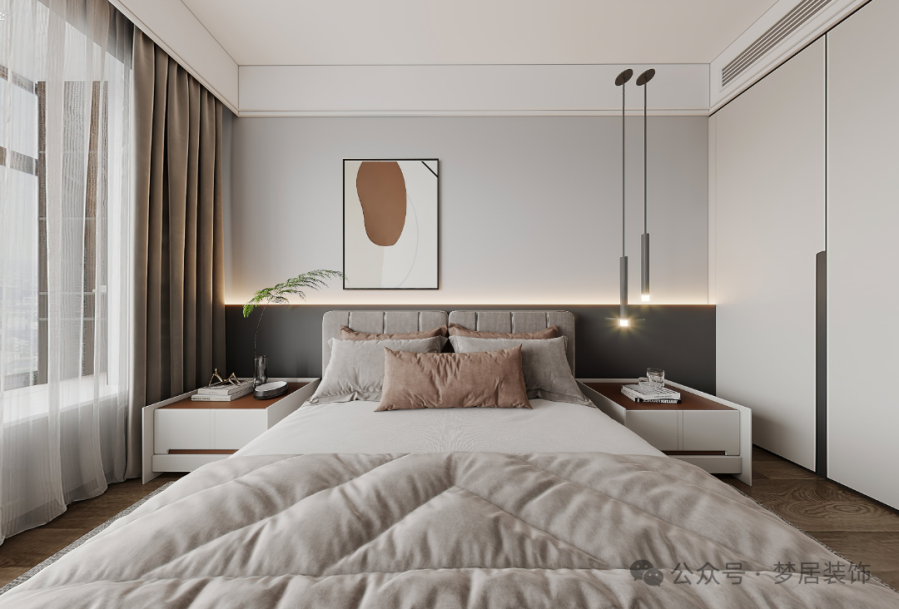 主臥背景墻的設(shè)計(jì)融合了裝飾性與功能性,暗藏?zé)魩г黾邮覂?nèi)光線,增強(qiáng)空間氛圍。搭配舒適床品,空間細(xì)膩又富有層次感。定制柜與墻面保持同色系,格局整潔有序。