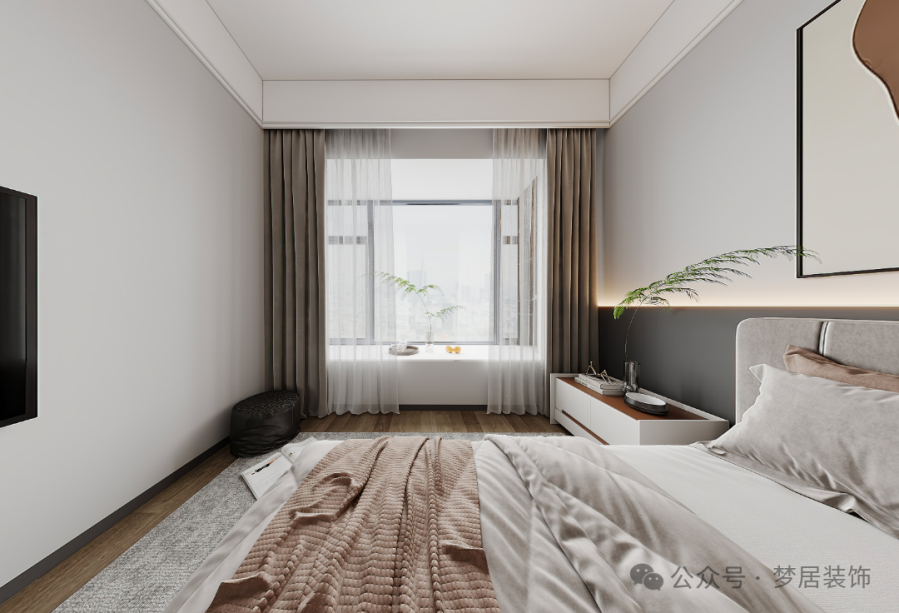 臥室選擇木地板,溫潤(rùn)舒適,木質(zhì)紋理和色澤為空間增添了溫馨質(zhì)樸的感受。