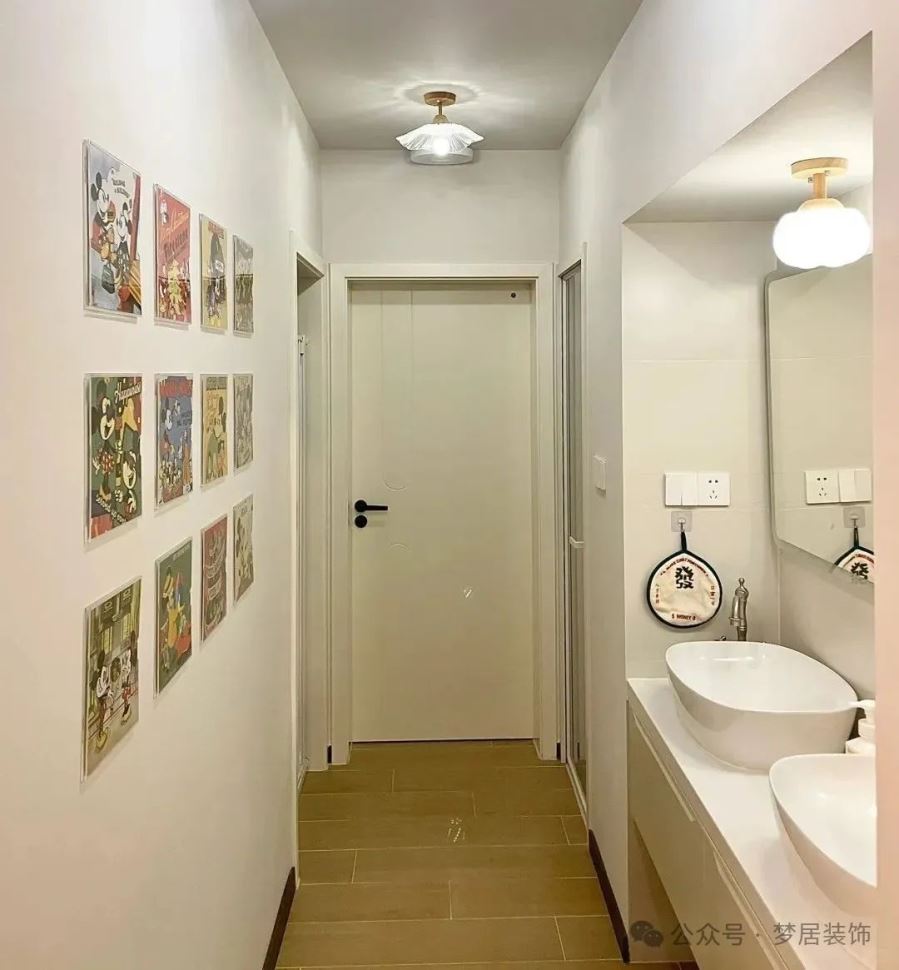 對(duì)于有走廊的家庭,洗手臺(tái)外移至走廊可以充分利用空間。這種設(shè)計(jì)不僅解決了衛(wèi)生間擁擠的問(wèn)題,還能讓走廊看起來(lái)更有設(shè)計(jì)感。