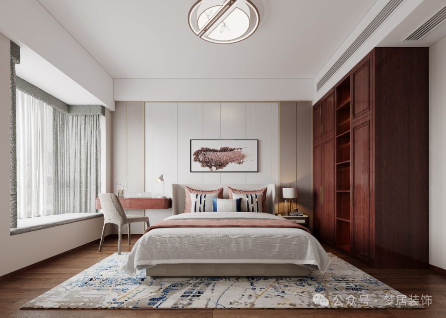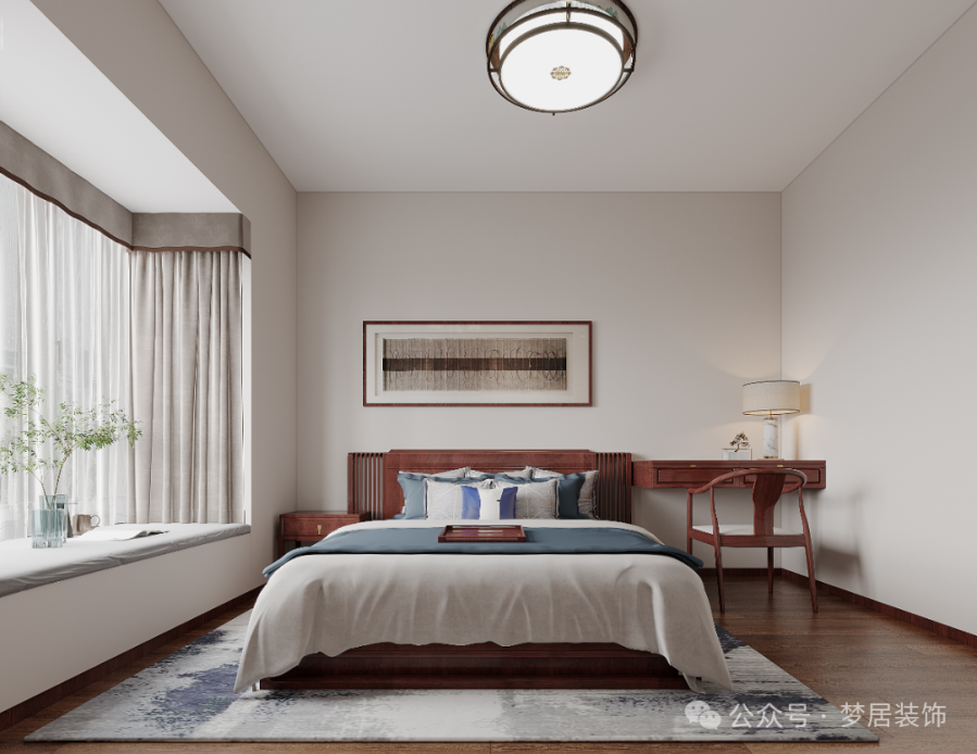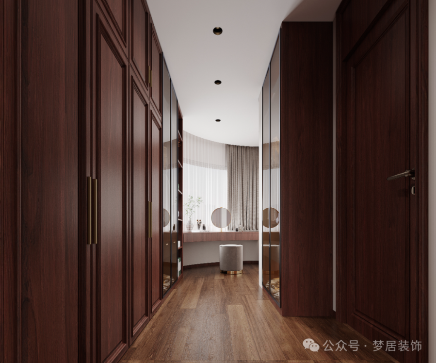 衣帽間營造出一個靜謐有序、充滿中式雅韻的衣物收納與穿搭空間。深色實木衣柜穩(wěn)重且富有質(zhì)感,滿足衣物的收納需求。飄窗邊設(shè)置梳妝臺,臺面選用溫潤的木質(zhì)柜體,下方設(shè)置抽屜,可收納小件物品。