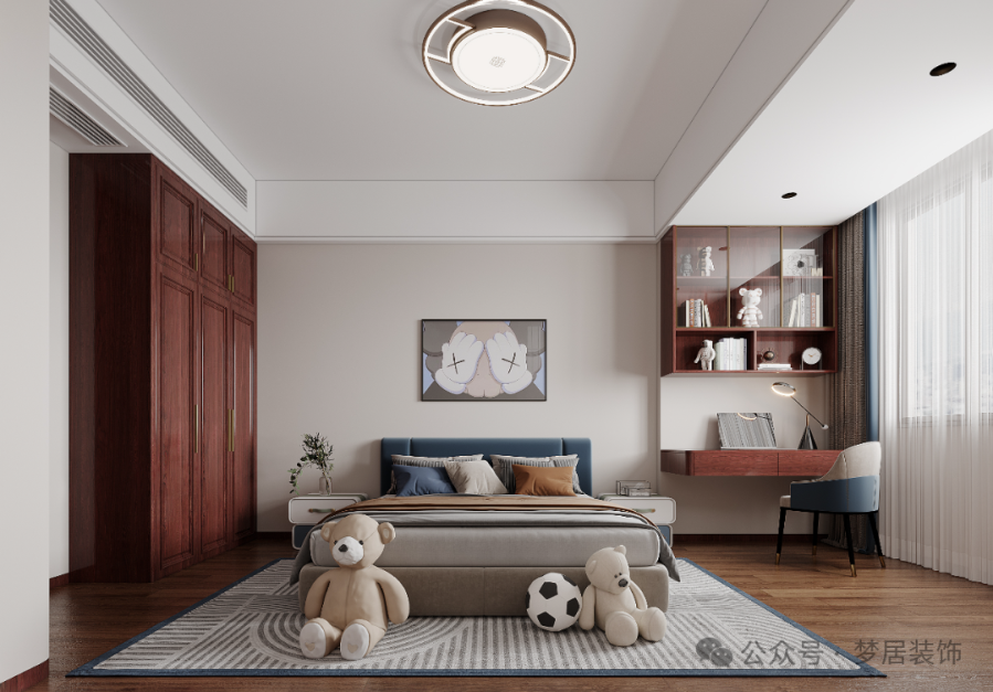 男孩房在中式風(fēng)格基礎(chǔ)上融入現(xiàn)代活力元素。造型簡約書桌與衣柜讓空間更顯干凈利落。書桌滿足學(xué)習(xí)需求,上方設(shè)置書柜;現(xiàn)代化的床品、地毯和玩具鮮明活潑,打造出富有朝氣與個性的成長空間。