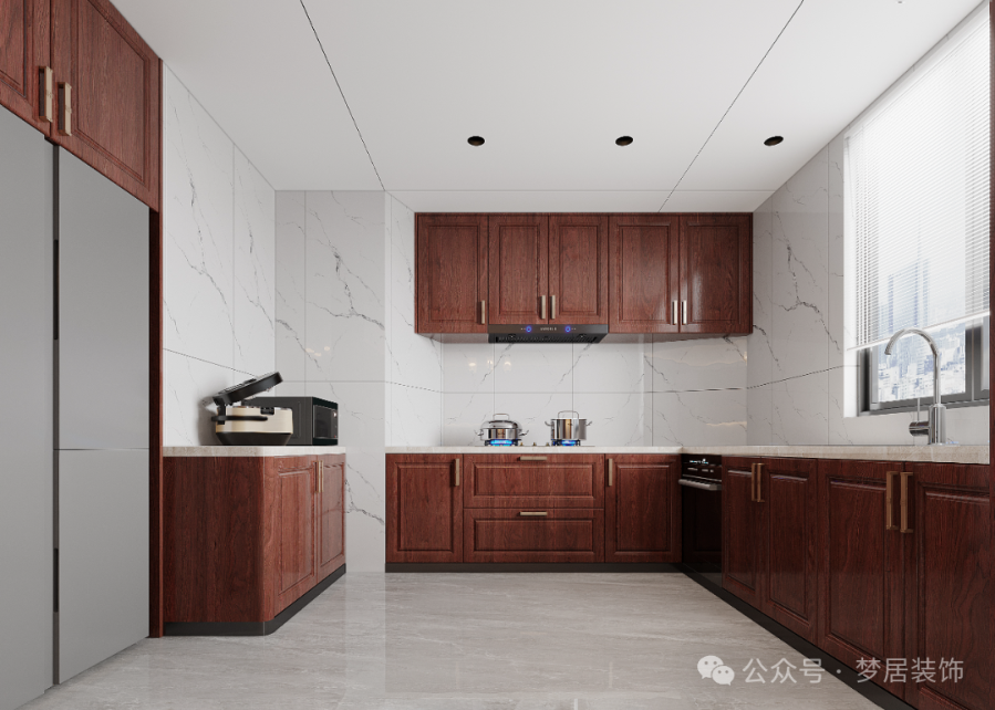 廚房同樣延續(xù)了中式韻味,嵌入式廚電與櫥柜完美融合,櫥柜門搭配簡潔的金屬拉手,既有中式韻味又兼顧現(xiàn)代實用性。讓廚房在滿足功能需求的同時,保持整體空間的和諧。