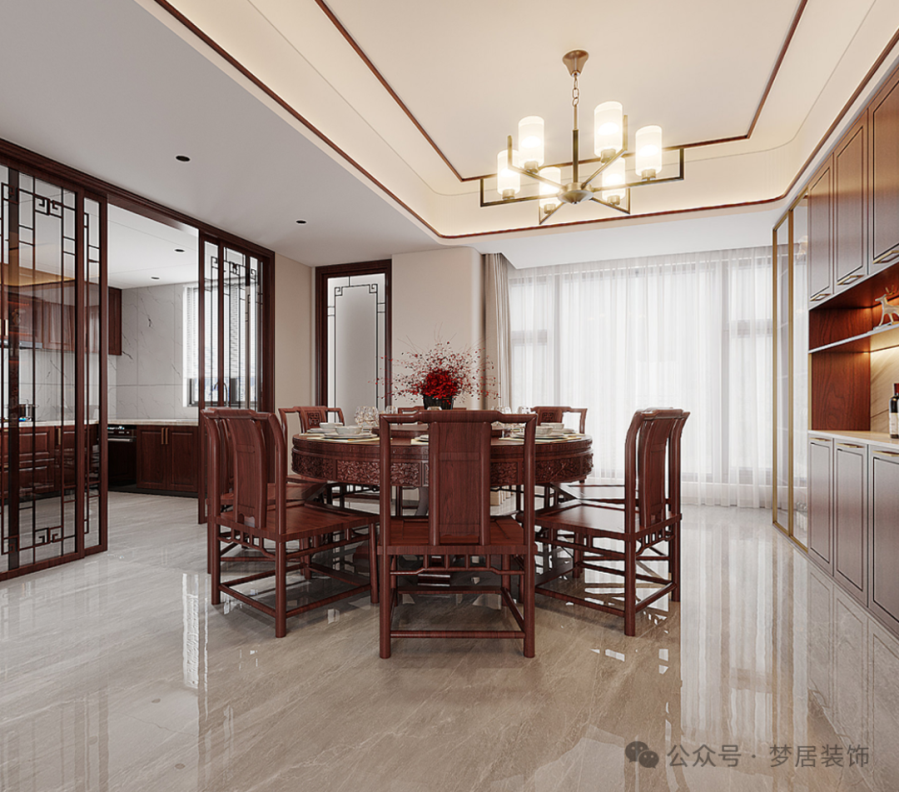 餐桌上精致的中式餐具與插花,為用餐增添儀式感。家人相聚、賓客宴請,皆能在這典雅大氣的空間中感受傳統(tǒng)家居的韻味。