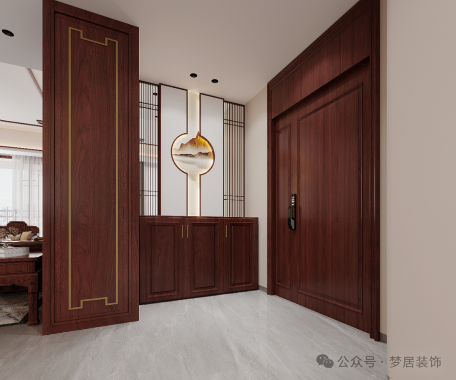 入戶以簡潔而飽含格調(diào)的中式元素開啟歸家禮序。定制的中式玄關(guān)柜,采用紅棕色實木打造,紋理細(xì)膩,質(zhì)感沉穩(wěn)厚重。