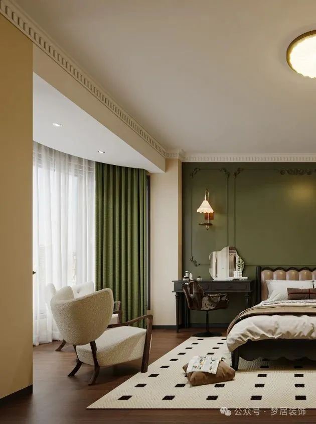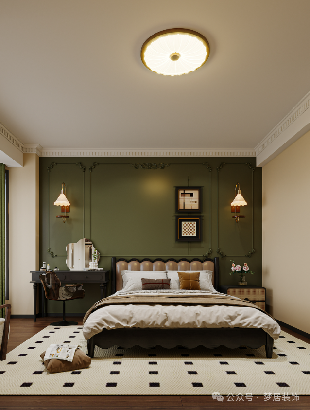 整面復(fù)古綠背景墻分割出空間的立面效果,恰當(dāng)?shù)貙⒁曈X(jué)中心引導(dǎo)在此,裝飾性的擺件與掛畫(huà)豐富空間層次的同時(shí),塑造出空間的復(fù)古氛圍質(zhì)感。