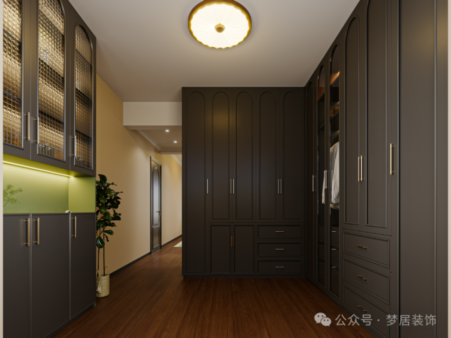衣帽間兼書(shū)房設(shè)計(jì),黑色柜體形成大面積的深色塊面塑造出靜謐的場(chǎng)域環(huán)境,潛移默化間完成動(dòng)靜轉(zhuǎn)換的心理暗示。深色柜子搭配金色拉手,呈現(xiàn)出暗金色系獨(dú)有的高級(jí)質(zhì)感。