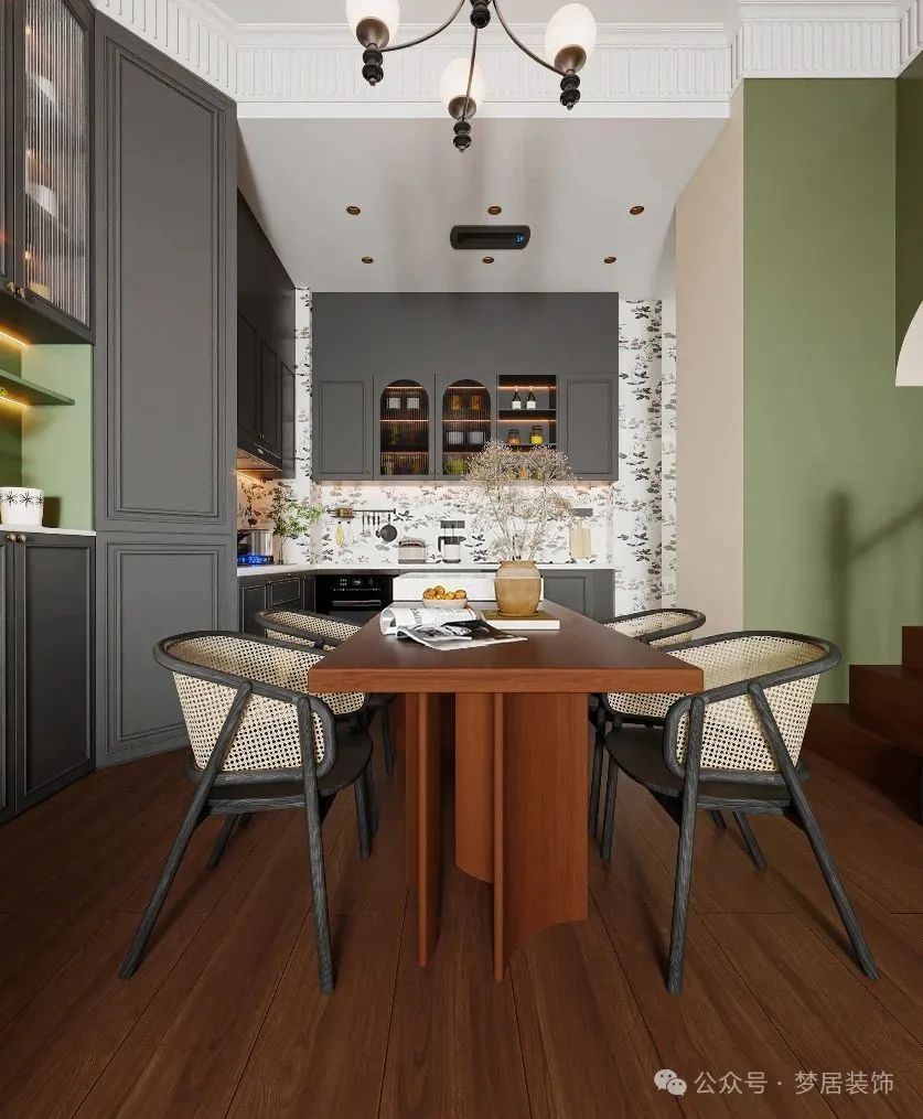 清新細(xì)膩的廚房花鳥(niǎo)花磚、舒適的藤編木椅復(fù)刻自然意趣,給予空間滿(mǎn)滿(mǎn)的高級(jí)浪漫感,櫻桃木的餐桌與木地板相互呼應(yīng),整個(gè)空間自帶中古氛圍濾鏡。
