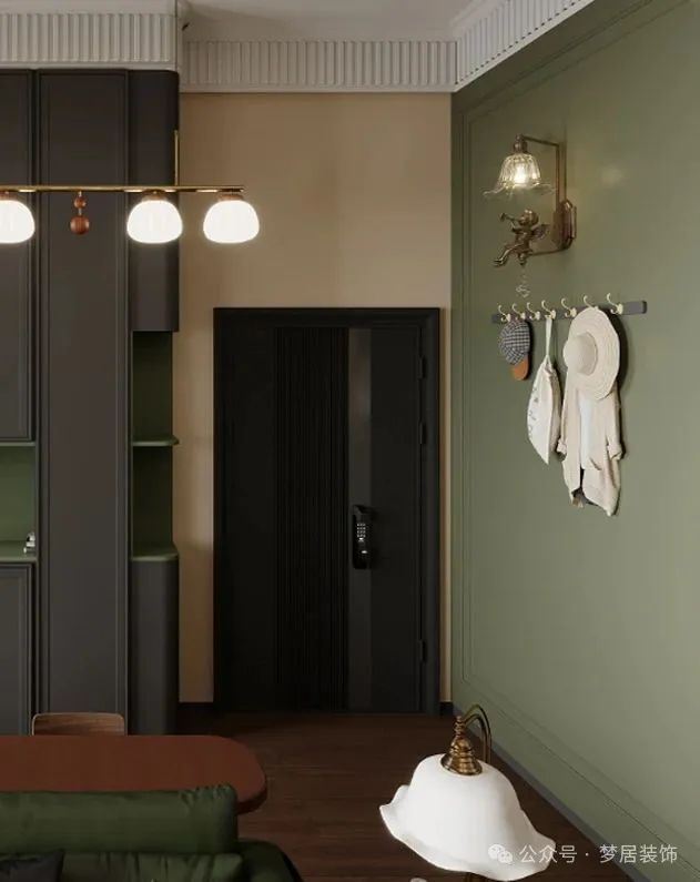 入戶(hù)墻面增加掛鉤,上置一盞復(fù)古壁燈,黃銅底座搭配琉璃燈罩,營(yíng)造出超有格調(diào)的空間氛圍。