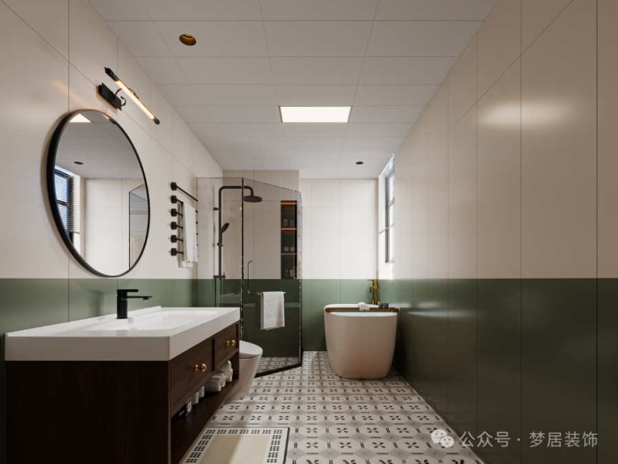 浴室延續(xù)整體色調(diào)邏輯,復(fù)古綠半墻包裹空間,營(yíng)造靜謐的時(shí)光。啞光磚呈現(xiàn)的沉靜質(zhì)感,細(xì)膩溫柔,營(yíng)造出放松的沐浴環(huán)境。